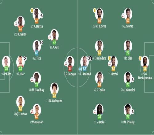 曼城(4141):25-多纳鲁马;5-斯通斯(73’27-努内斯),3-迪亚斯,24-格瓦迪奥尔,33-奥莱利;16-罗德里(61’14-尼科);20-B席,4-赖因德斯,47-福登,11-多库(61’26-萨维尼奥);9-哈兰德