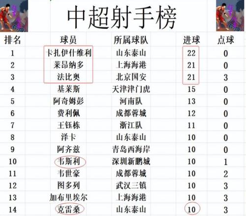 射手榜方面,卡扎伊什维利22球继续领跑,法比奥昨晚无力破门,还是和莱昂纳多差榜首1球并列第2。基莱斯15球排在第4,阿奇姆彭13球位列第5。克雷桑点射,韦斯利传射建功,两人追上泽卡,韦世豪等人10球刚好挤入前十。