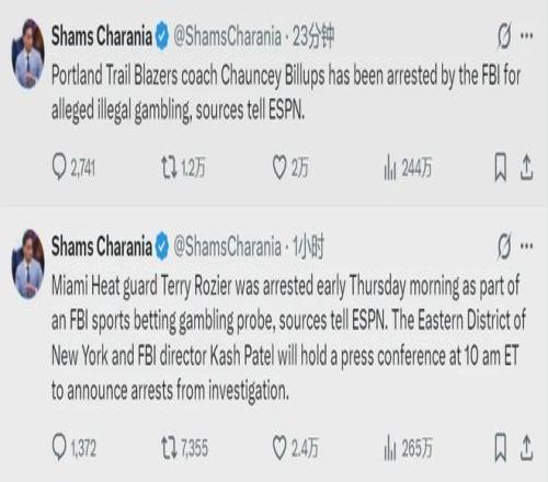 Shams撰文披露了更多细节:比卢普斯和罗齐尔被逮捕,是两个不同的案件。罗齐尔是伙同他人下注比赛,比卢普斯则涉及与黑手党有关的非法扑克经营,而不是直接下注比赛。今年4月份,比卢普斯刚跟开拓者签下多年续约合同。