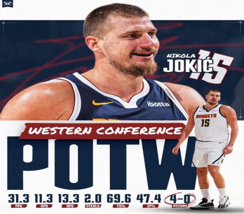 过去这一周,30岁的约基奇场均贡献31.3分、11.3个篮板、13.3次助攻和2.0次抢断,投篮命中率达69.6%,三分命中率为47.4%,带领掘金队取得了4胜0负的不败战绩。