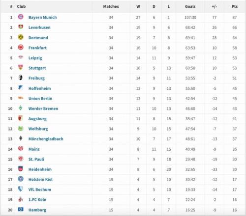 2025年度德甲积分榜:拜仁34场仅1负遥遥领先,勒沃库森第二